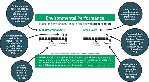 Check the Fuel Economy and Environment label on the car. This label provides a smog rating, and a rating for fuel economy and greenhouse gas emissions.
