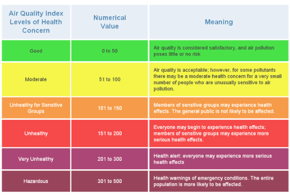 You can check the conditions by looking at the Air Quality Index (AQI) chart. The AQI translates pollutant measurements into a more visual look at air quality conditions.