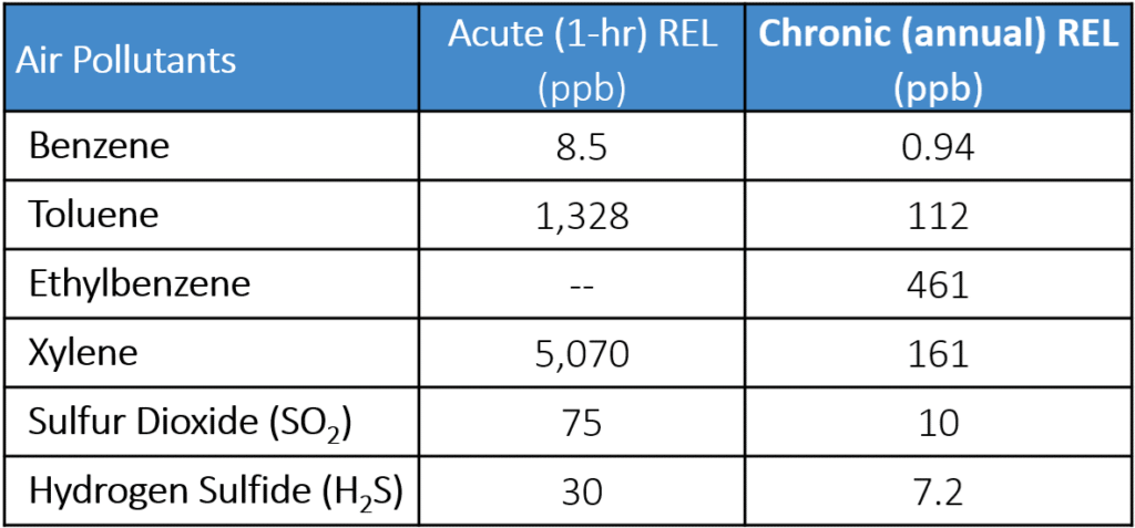 A Reference Exposure Level (REL) is an airborne concentration level of a chemical in which no adverse health effects are anticipated for a specified exposure duration. They are established by the California Office of Environmental Health Hazard Assessment (OEHHA) to protect the most sensitive individuals in the population. The 1-hour and annual RELs for the monitored pollutants are listed below, given in units of parts per billion (ppb).