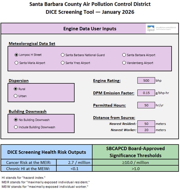 The DICE Screening Tool was created using the Non-Vehicular Diesel Engine Risk Assessment Screening Tool developed by the California Air Pollution Control Officer’s Association (CAPCOA) and the California Air Resources Board (CARB). More information can be found in the District’s Background Document for DICE Screening Tool.