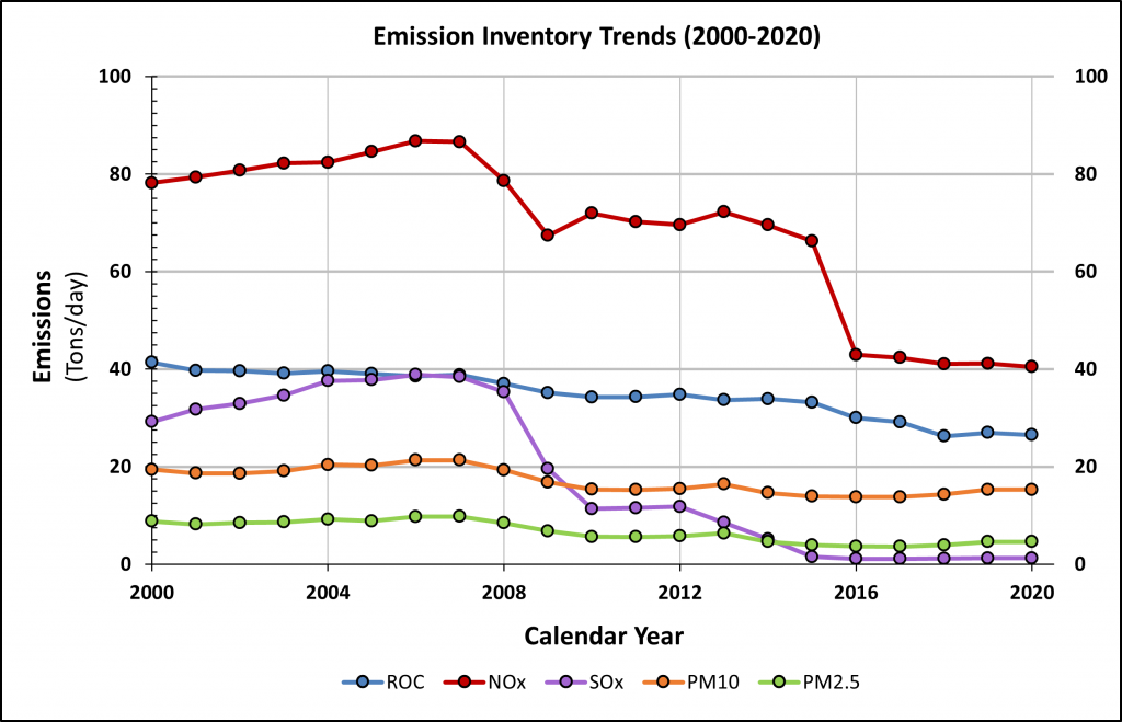 The District’s emission inventory accounts for pollutants emitted from all anthropogenic emission sources (human-made sources, which excludes natural sources) that are generated onshore within Santa Barbara County as well as those emissions within 100 nautical miles offshore (on the Outer Continental Shelf). The historical emission trends show that emissions have generally decreased over time, largely due to the implementation of District emission control measures as well as state and federal regulations that control mobile sources.
