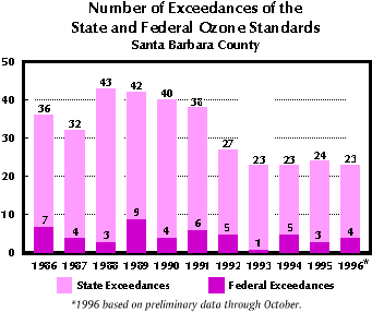 Failure to meet the 1996 deadline does not mean our air is getting worse. In fact, our air quality continues to improve. The figure on page 2 shows the total number of state and federal ozone violations each year since 1986. Totals for 1996 are based on preliminary data through October.