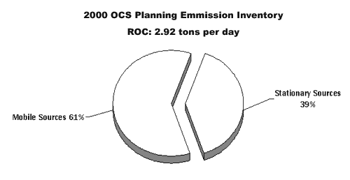 Figure EX-2 shows the attainment emission inventory for 1999. This figure presents the estimated emissions of reactive organic compounds and oxides of nitrogen, (precursors that combine to form ozone), generated locally from human activities and does not include emissions on the Outer Continental Shelf or those from natural sources (seeps and vegetation). The largest contributor to our locally generated air pollution is on-road mobile sources (cars and trucks), which combine to contribute over 60 percent of the reactive organic gases and 88 percent of the emissions of oxides of nitrogen. Other mobile sources (planes, trains, boats), the evaporation of solvents, combustion of fossil fuels, surface cleaning and coating, and petroleum production and marketing combine to make up the remainder. Figure EX-3 shows the attainment emission inventory for the Outer Continental Shelf, where the majority of reactive organic gas and oxides of nitrogen emissions comes from mobile sources (i.e., international marine vessels).